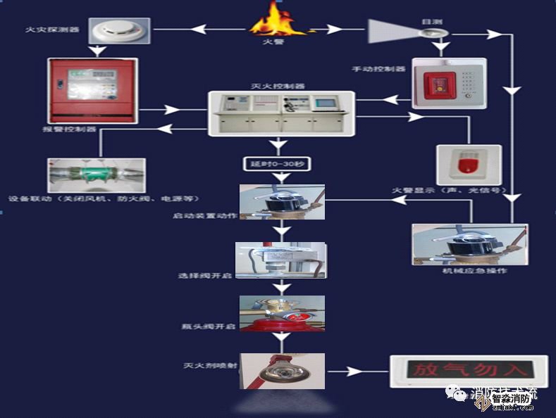 (1)自動(dòng)啟動(dòng):將滅火控制器上的控制方式選擇鍵撥至“自動(dòng)”位置,滅火系統(tǒng)則處于自動(dòng)控制狀態(tài)。當(dāng)保護(hù)區(qū)發(fā)生火情時(shí),火災(zāi)探測器發(fā)出火災(zāi)信號(hào)(兩個(gè)獨(dú)立探測器信號(hào),一般先是煙感報(bào)警再到溫感),經(jīng)報(bào)警控制器確認(rèn)后,滅火控制器即發(fā)出聲、光報(bào)警信號(hào),同時(shí)發(fā)出聯(lián)動(dòng)指令,相關(guān)設(shè)備聯(lián)動(dòng),經(jīng)過一段延時(shí)時(shí)間,發(fā)出滅火指令,打開容器閥的電磁釋放啟動(dòng)氣體,啟動(dòng)氣體通過啟動(dòng)管路打開相應(yīng)的選擇閥和容器閥,釋放滅火劑,實(shí)施滅火。