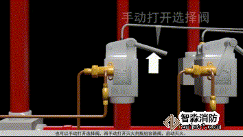 1、 確認(rèn)發(fā)生火災(zāi)的防護(hù)區(qū),找到防護(hù)區(qū)對應(yīng)的選擇閥,手動打開選擇閥;