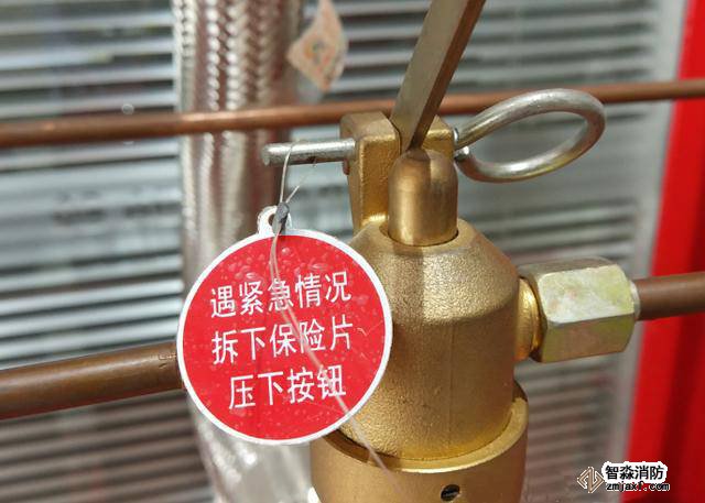 滅火劑瓶組保險銷位于滅火劑瓶組的瓶頭閥上,正常情況下,此保險銷不能解除。只有當(dāng)發(fā)生火災(zāi)時,氣體滅火控制系統(tǒng)失效,而且啟動瓶組也失效的情況下,才能解除這個保險銷,以機(jī)械應(yīng)急方式啟動滅火劑瓶組,實(shí)施滅火。