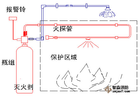 火探管系統主要是由裝有滅火劑的壓力容器、控制閥及能釋放滅火劑的火探管和/或釋放管等組成。它滅火原理是將火探管伸入電氣設備內部,置于靠近或在火源最可能發生處的上方,依靠沿火探管的諸多探測點(線型)進行探測?;鹛焦茴A充有氮氣,管內有一定的壓力,一旦著火,火探管周圍環境溫度升高,使其在最近火點的部位首先軟化,強度下降,在管內氮氣壓力的作用下形成爆破口,管內預充的氮氣很快釋放,使控制閥兩側火探管內壓力和鋼瓶內的壓力失衡,控制閥打開,滅火介質通過火探管本身爆破口(直接系統)或噴嘴(間接系統)釋放到被保護區域,從而達到自動探火、滅火的目的。