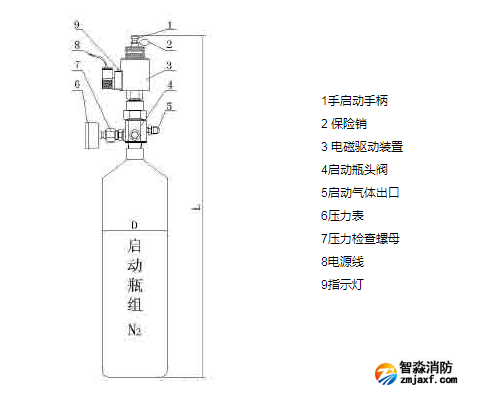 IG541混合氣體啟動瓶組由貯存鋼瓶、瓶頭閥、壓力表、電磁驅動裝置(帶手啟動手 柄及保險銷)組成,瓶內充裝氮氣(N2),作為驅動氣體。瓶組容積有4L、7L、40L三種規格。4L、7L有標準的瓶組架,40L可安裝于滅火劑瓶組架 兩側,也可定制瓶組架。啟動瓶組有自動和應急操作兩種啟動方式。自動啟動受來自火災自動報警控制器的控制,電磁驅動裝置動作,啟動瓶組開啟,實現自動啟 動。若自動啟動失靈或無法實現,需進行機械應急操作,拔下電磁驅動裝置上保險銷(見圖),用手按下手啟動手柄(見圖),啟動瓶組開啟,實現應急操作啟動。 啟動瓶組的壓力表后部有檢測壓力的螺母,在檢測啟動瓶組壓力時,用扳手按逆時針方向旋轉螺母至壓力顯示,檢測完畢后,按順時針方向旋緊,然后逆時針旋松壓 力表,放掉壓力表內氣壓,使指針回零,再把壓力表復位。