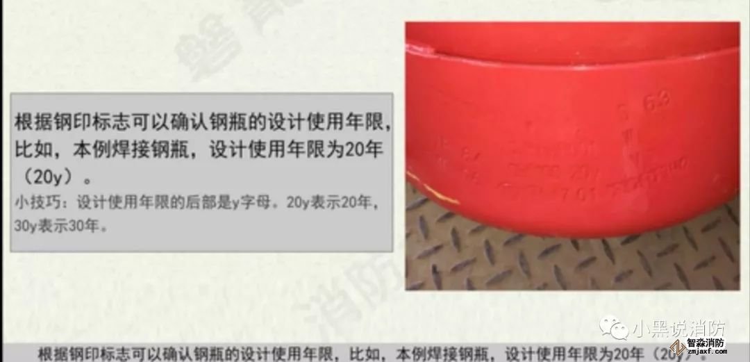 根據(jù)規(guī)程中表3-5,氣體滅火系統(tǒng)的儲(chǔ)氣瓶有無(wú)縫鋼瓶和焊接鋼瓶,使用年限分別為30年和20年,而這些數(shù)據(jù)根據(jù)該規(guī)程要求在出廠時(shí)應(yīng)作為永久性標(biāo)志刻在鋼瓶瓶身,仔細(xì)觀察,可以在瓶身上看到氣瓶的設(shè)計(jì)使用年限。